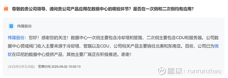 公司数据中心领域阀门收入主要来源于冷却塔、管路以及CDU,公司相关产品主要销往北美和东南亚。