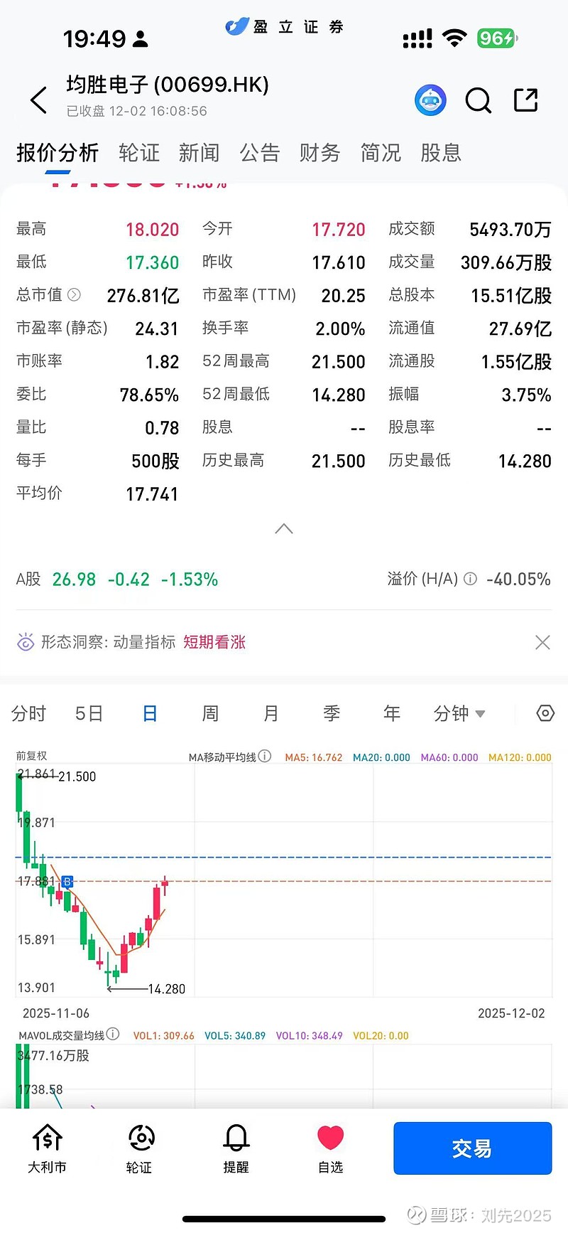$均胜电子(00699)$ 17加仓后,准备再跌20%到13.6加仓,看来是不给机会了,不过能涨上去也是好事,毕竟没人能买在最低点,即使加仓想加到最低点都难。