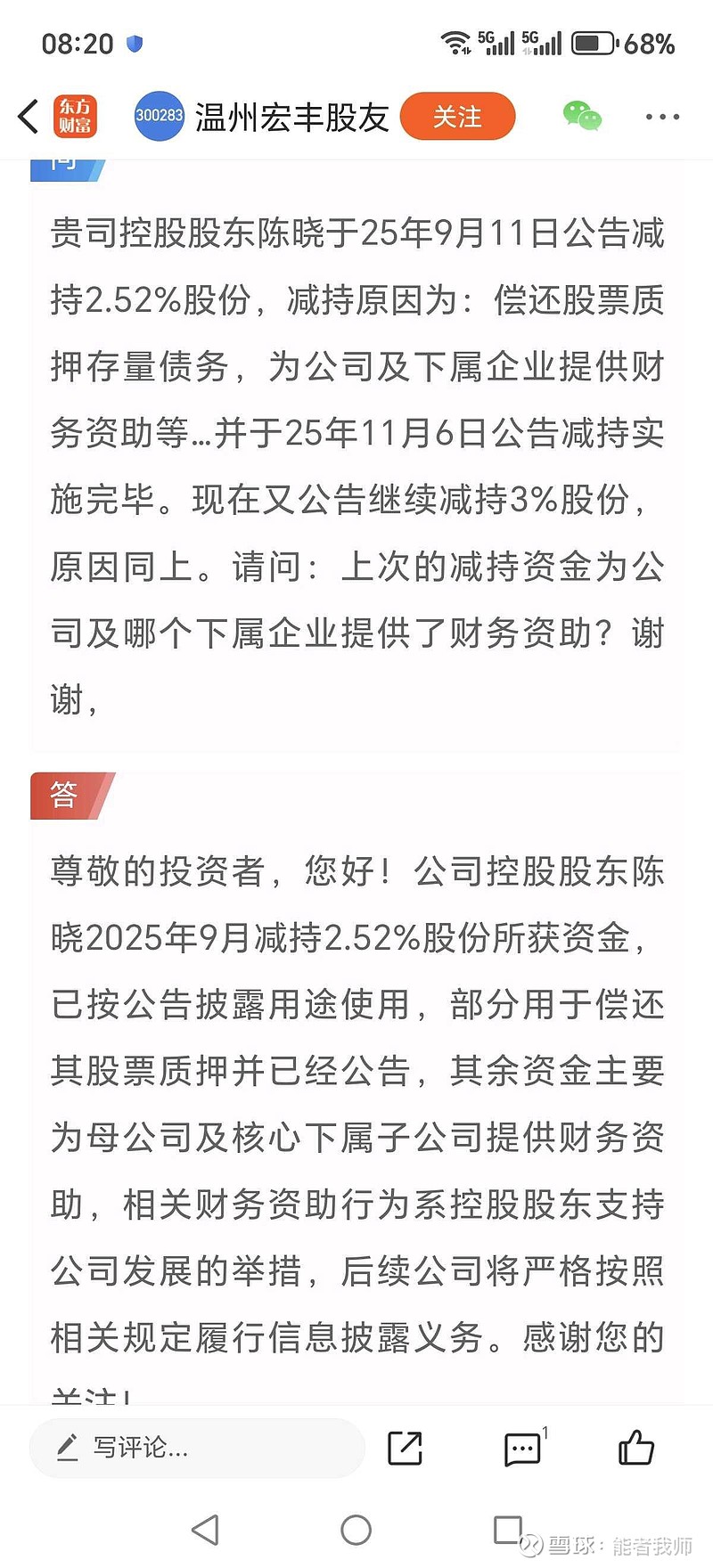 昨晚回复我了,减持确实不是为了改善生活……