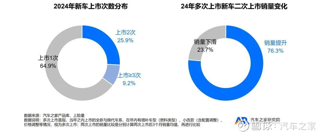 虽然每年仅有6%的新车可以实现成功上市(以销量衡量),但是不“焕新”可能意味着销量会更差,所以车企仍然会将砝码押注到新车上,一款新车如果上市期销量不理想、或者出现了新的竞争情况,甚至会进行二次或多次上市。2024年出现这种情况的新车占比达到了35%,并且效果显著,76%的二次上市都实现了销量提升,车系型谱和价格是调整的主要方向,从而增加产品竞争力。但再次上市不会向首次上市那样“声势浩大”,受制于成本因素,多数车企不会再举办一次上市发布会, “线上发布会”等低成本的方式是造势手段之一,更多车企会选择线上专业内容进行二次新车传播。