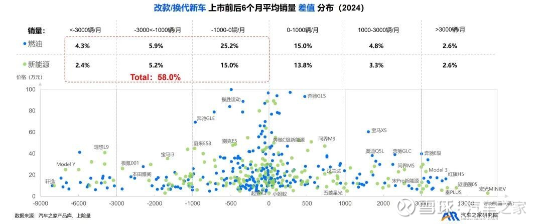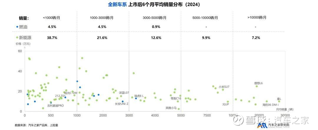 虽然每年有600多个新车上市,但是真正能够实现规模销量的成功新车却少之又少。在全新车系中,月销大部分在3000台以内,超过5000台的全新车仅占17%,燃油车更是难觅身影。在改款换代新车中,甚至有6成新车月均销量不增反降。