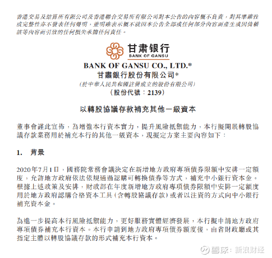 同日,甘肃银行发布公告称,拟开展转股协议存款业务用于补充该行的其他一级资本。