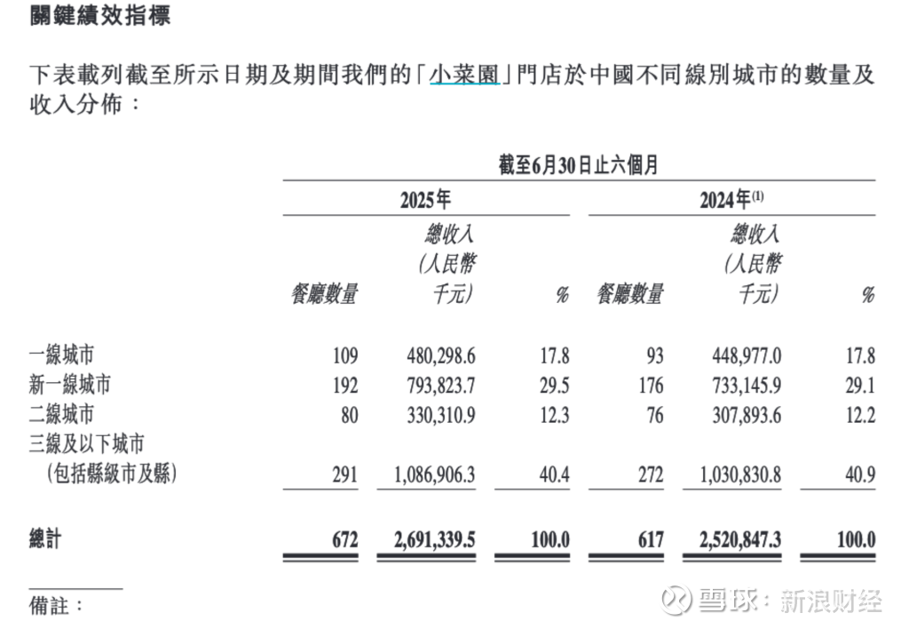 门店数量方面,小菜园从2024年6月30日的617家增至2025年6月30日的672家,其中,三线及以下城市门店291家,占比超四成,贡献了超四成的营收;新一线城市门店176家,占比近三成,营收占比29.5%。