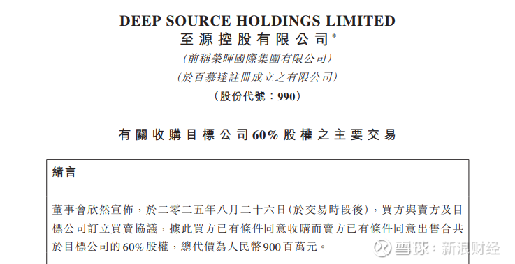 香港上市公司至源控股(00990.HK)公布,于2025年8月26日(于交易时段后),买方、卖方(楚江集团、内蒙古冠晖)、目标公司(安徽楚江恒创企业管理咨询有限公司)订立买卖协议,据此买方已有条件同意收购而卖方已有条件同意出售合共于目标公司的60%股权,总代价为9.00亿元人民币。
