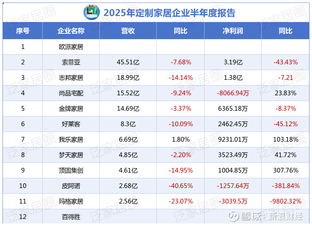 截至8月27日晚,索菲亚、志邦、尚品宅配、金牌、好莱客、我乐、顶固、梦天、皮阿诺、玛格等10大定制企业皆已发布2025年半年度业绩报告。详细数据如下: