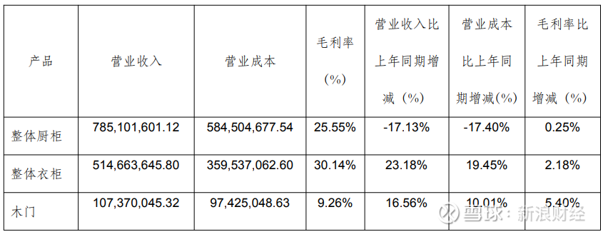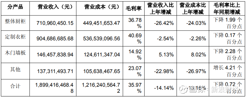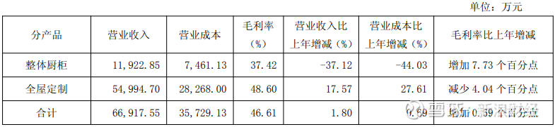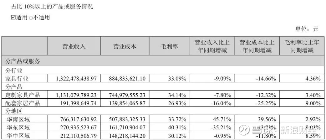 分产品来看,定制家居产品收入11.31亿元,同比下降7.80%,毛利率34.14%,同比增加3.40%;配套家居产品收入1.91亿元,同比下降16.04%,毛利率26.93,同比增加9.00%。