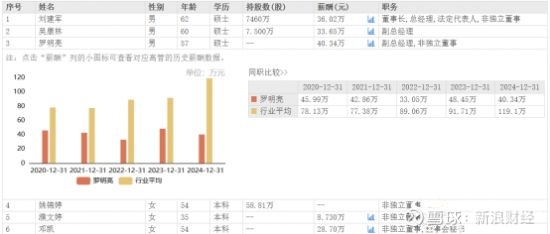 而在公司利润大幅增长的背景下,公司高管薪酬却纷纷下降。罗明亮2024年薪酬为40.34万元,相较于2023年的48.45万元,下降了8.11万元,是去年高管薪酬降幅最大的。尽管如此,罗明亮去年薪酬仍是公司高管中最多的。董事长兼总经理刘建军去年薪酬36.02万元,而另一位副总经理吴康林薪酬仅为33.65万元,近五年薪酬从未高于40万元。