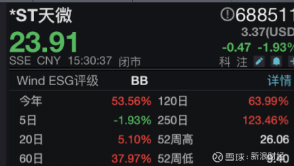 截至8月29日收盘,*ST天微股价报收于23.91元/股,年内涨幅达53.56%,总市值为24.59亿元。