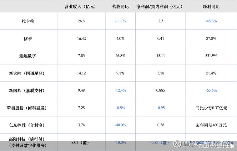 同样“双降”的还有嘉联支付,营收报9.49亿元,同比减少12.9%,净利润8850万元,同比降65.6%;随行付母公司高阳科技半年报显示,其支付及数字化服务板块营收8.01亿港元,同比减少10%,并出现亏损8333万港元。