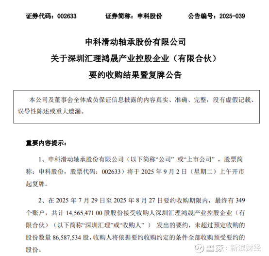 申科股份披露的要约结果显示,要约收购期限内,最终有349个账户,共计1456.55万股股份接受收购人深圳汇理发出的要约,未超过预定收购的股份数量8658.75万股,收购人将依据要约收购约定的条件全部收购预受要约的股份。