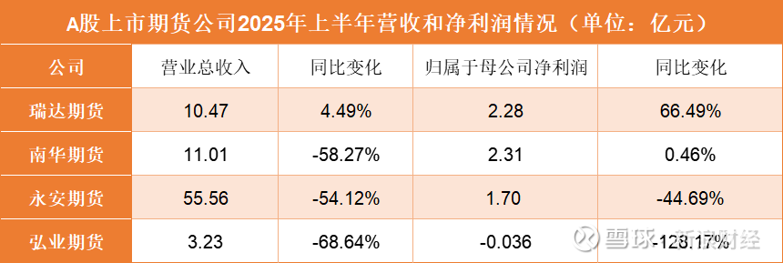 据界面新闻统计,上半年,南华期货、永安期货(600927.SZ)、瑞达期货(002961.SZ)和弘业期货四家公司累计营收80.27亿元,累计净利润6.25亿元。