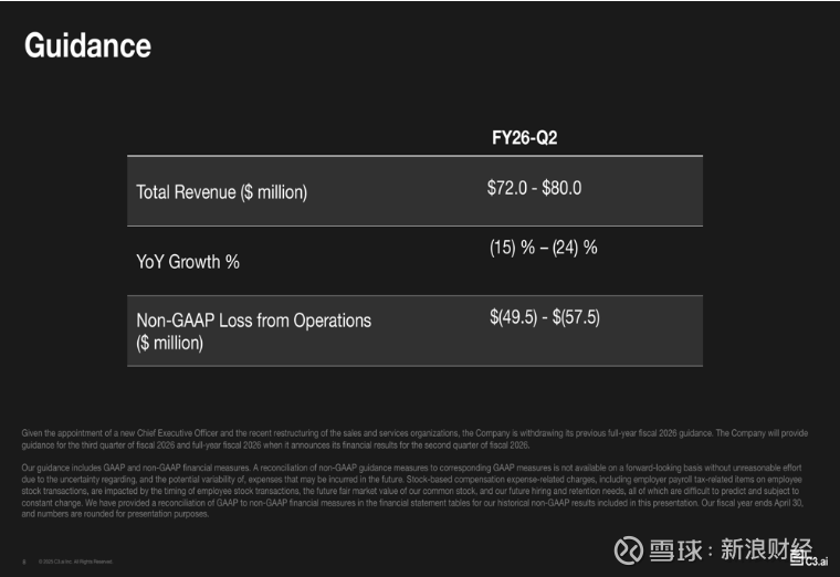 展望未来,C3.ai预计2026财年第二季度营收在7200万至8000万美元之间,同比下降15%至24%,与上一季度的增长预期形成对比。因新任CEO就任及重组工作推进,公司撤回此前发布的2026财年全年业绩指引,管理层表示将在公布第二季度业绩时提供更新指引。