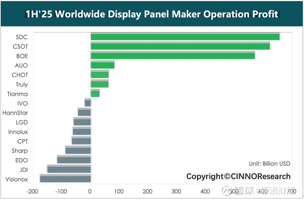 此外,上半年共有7家上市面板企业实现盈利,具体利润排名中,三星显示仍居全球第一。TCL华星和京东方分别位列第二和第三,三者营业利润均约6亿美元。亏损最为严重的企业为维信诺、JDI及和辉,亏损额均超1亿美元。乐金显示营业亏损从4.25亿美元大幅收窄至0.6亿美元,改善明显。