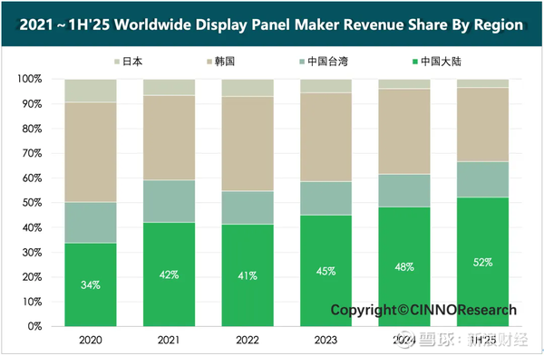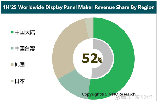 CNMO还了解到,中国大陆面板厂商总营收约为293亿美元,全球占比52.1%,同比增长3.3个百分点,首次占据全球过半份额,展现出显著的领先优势。韩国企业营收占比则下滑至30%,同比减少3.2个百分点;中国台湾地区企业占比13.2%,小幅增长0.6个百分点;日本企业占比3.5%,同比下滑0.7个百分点。