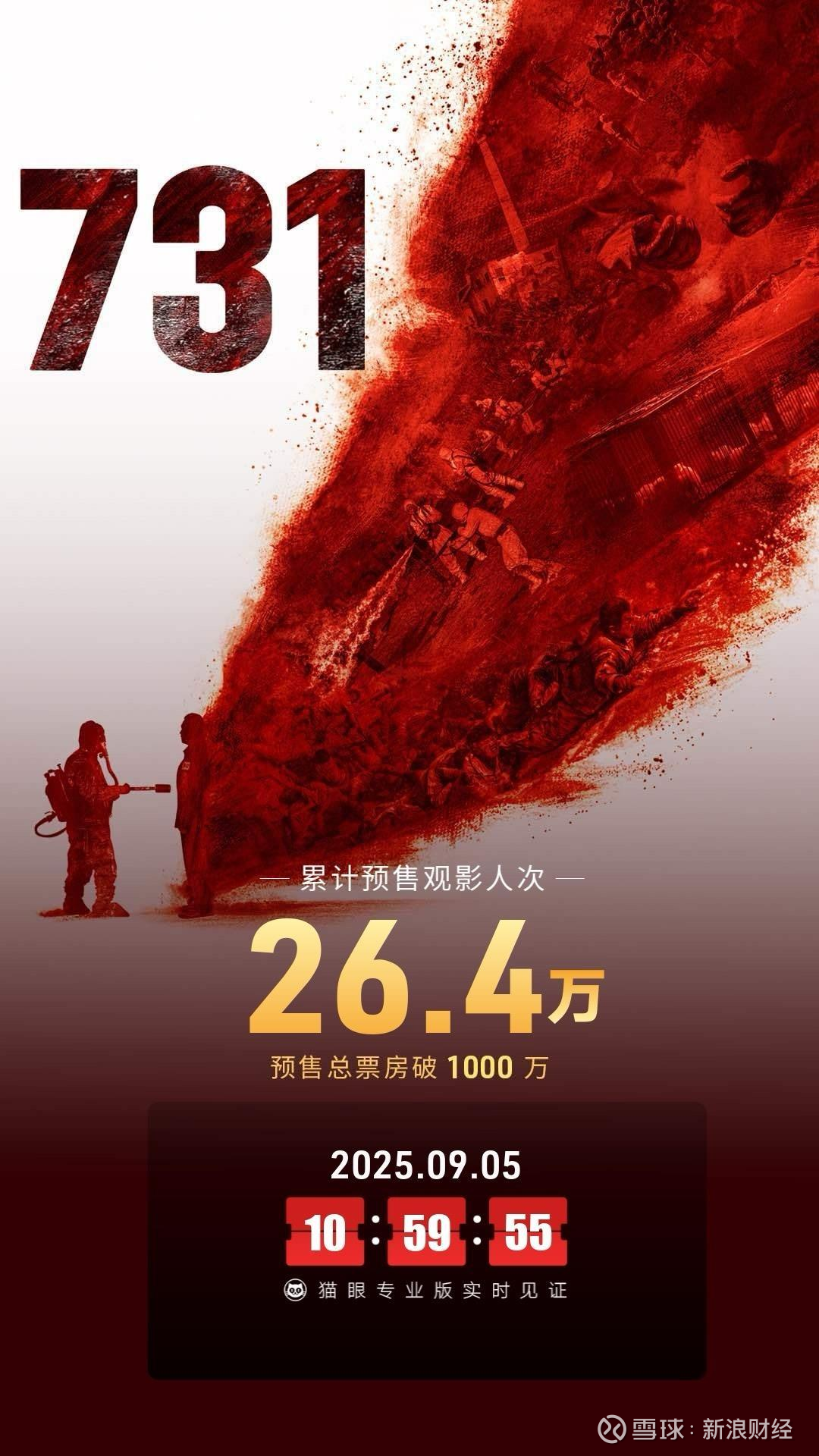 电影《731》聚焦侵华日军731部队的战争罪行,定档于2025年9月18日“九一八事变”94周年纪念日,其题材具有特殊的历史和现实意义。该片未映先火,猫眼平台“想看”人数已超590万,淘票票想看人数也超过210万,市场热度断层领先。