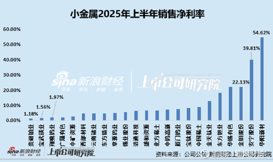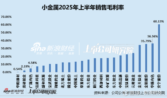 从销售毛利率的角度看,小金属行业多数上市公司的销售毛利率低于20%,2025年上半年,安宁股份销售毛利率位列榜首,公司销售毛利率为60.13%。相比较之下,贵研铂业、华阳新材销售毛利率不足3%,分别为2.19%、0.54%。