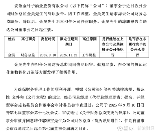 9月10日,金种子酒(600199.SH)发布公告称,公司财务总监金昊因工作调整辞职,同时聘任郭继宝为新任财务总监。