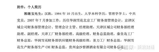 接任者郭继宝,拥有丰富的啤酒及白酒企业财务管理经验。其履历包括在华润雪花、喜力工厂、金沙窖酒等多家公司担任财务总监及核心财务管理岗位,具备跨区域、跨品牌的财务统筹背景。