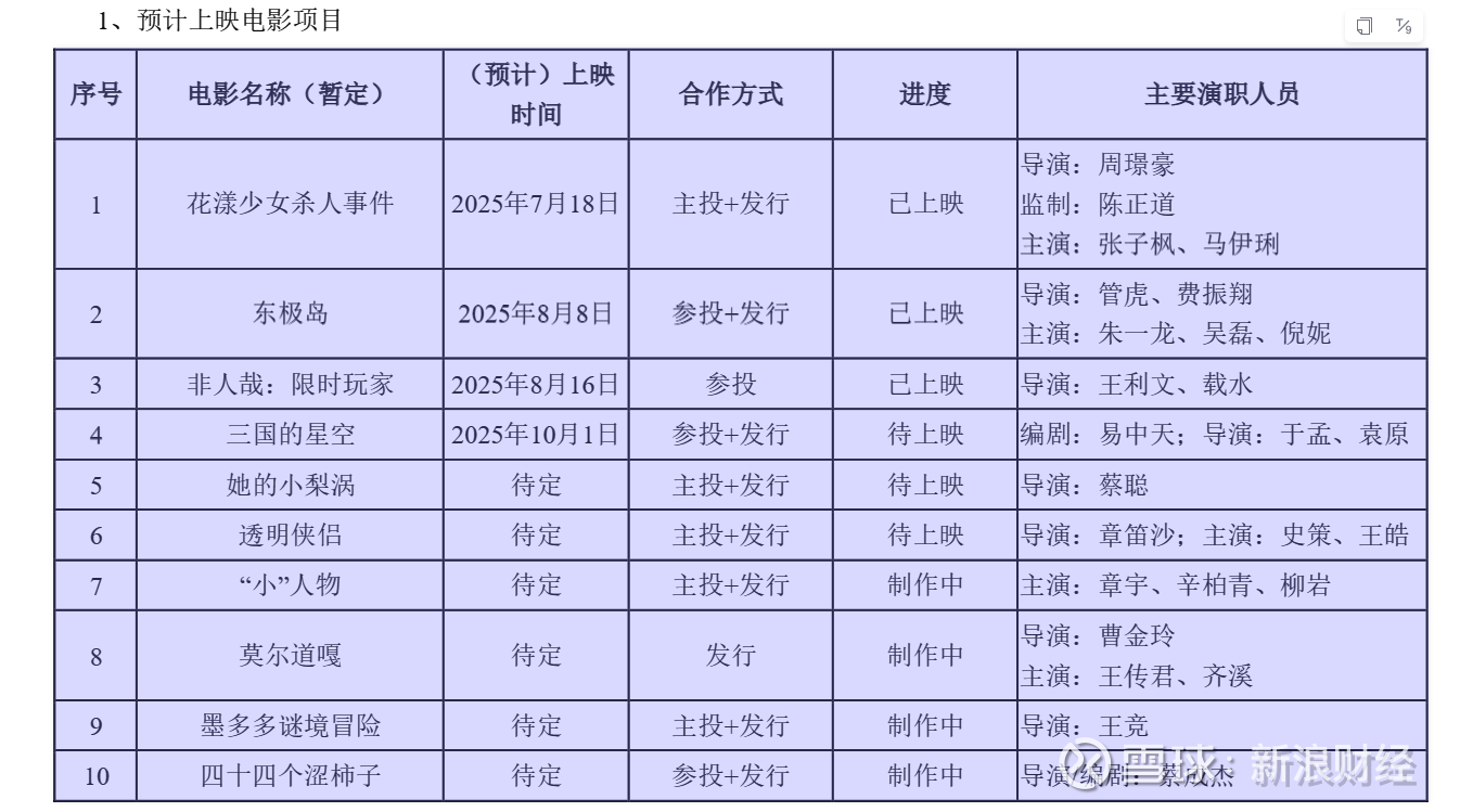 目前,真人电影《花漾少女杀人事件》《东极岛》、动画电影《非人哉:限时玩家》已分别于2025年7月18日、8月8日、8月16日上映,截至9月10日总票房分别为2890.7万元、3.91亿元及1452.1万元。