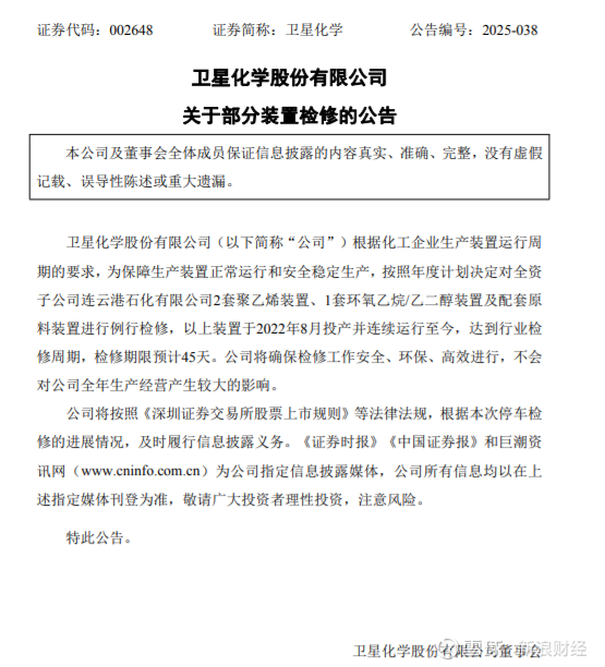 检修45天!卫星化学官宣“停产”,涉及聚乙烯、环氧乙烷!