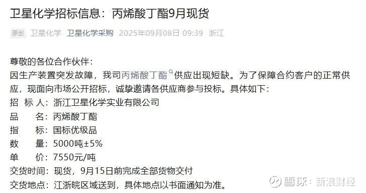 另外,9月8日,卫星化学发布公开招标信息,据悉该企业生产装置突发故障,丙烯酸丁酯供应出现短缺。