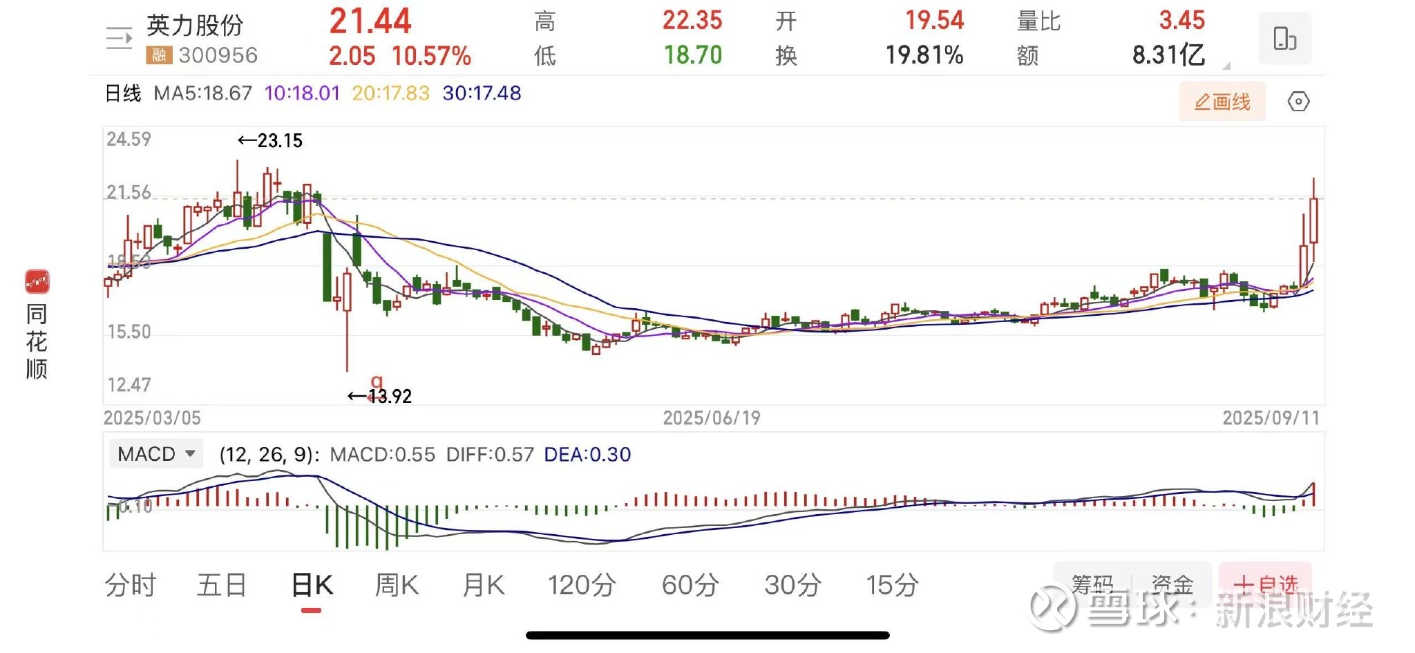 从盘中表现来看,英力股份自9月10日起连续两日涨幅超10%。9月11日,盘中一度涨超15%。