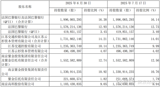 本次增持后,紫金集团及紫金信托缩小了与南京银行第一大股东法国巴黎银行及法国巴黎银行(QFII)合计持股的差距。南京银行此前公告显示,截至7月17日,法国巴黎银行及法国巴黎银行(QFII)对南京银行合计持股比例16.14%,其中法国巴黎银行持股比例12.75%,法国巴黎银行(QFII)持股比例3.4%。