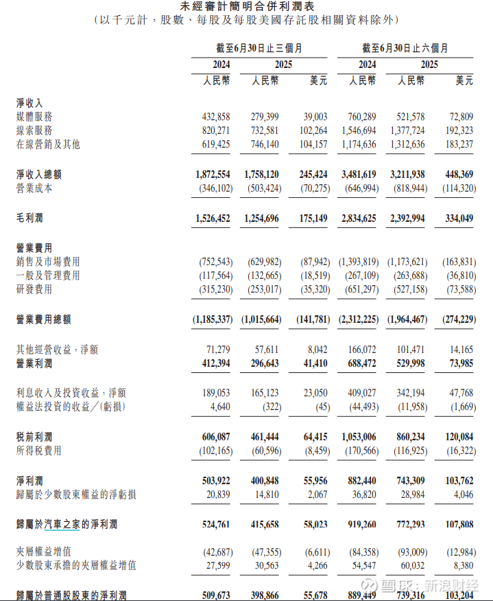 2025年上半年,汽车之家在收入结构上呈现出分化趋势,其中线索服务和在线营销及其他收入增长显著,但媒体服务收入有所下降。公司在成本控制方面取得一定成效,销售及市场费用和研发费用均同比下降。尽管净利润有所减少,但通过非GAAP指标可以看出,公司核心经营利润仍保持稳健。同时,用户规模和新零售业务的扩展为未来增长奠定了基础。