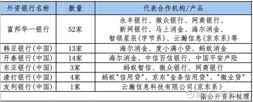 7月以来,富邦华一银行、韩亚银行(中国)、开泰银行(中国)、东亚银行(中国)、渣打银行(中国)等6家外资行密集披露互联网贷款合作名单。最引人瞩目的是,富邦华一银行合作机构数量高达52家,成为目前披露合作方最多的外资行。