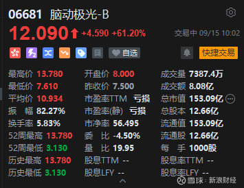 港股脑机接口概念股脑动极光-B一度拉升大涨超80%,报13.78港元,为连续第三日上涨,股价创上市新高,截至目前成交额放大至8亿港元。