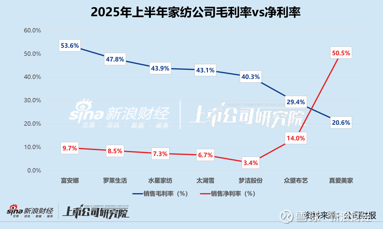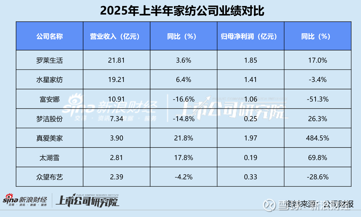 就收入规模而言,罗莱生活以21.81亿元居于榜首,约为第二名水星家纺上半年营收的1.14倍。众望布艺前6个月只实现了2.39亿元营收,在7家公司中居于末位。业绩公告显示,公司产品以外销为主,受关税政策影响,报告期内收入下降4.2%。此外,富安娜和梦洁股份营收也有明显下滑,尤其富安娜收入规模同比减少16.6%,核心产品套件类营收较2024年同期减少超21%。营收增幅最高的是真爱美家,其产品以毛毯为主,套件、被芯、枕芯等床上用品占比较少,渠道基本出口至中东、北非、南非等地区,新型功能性、装饰性毛毯需求旺盛。