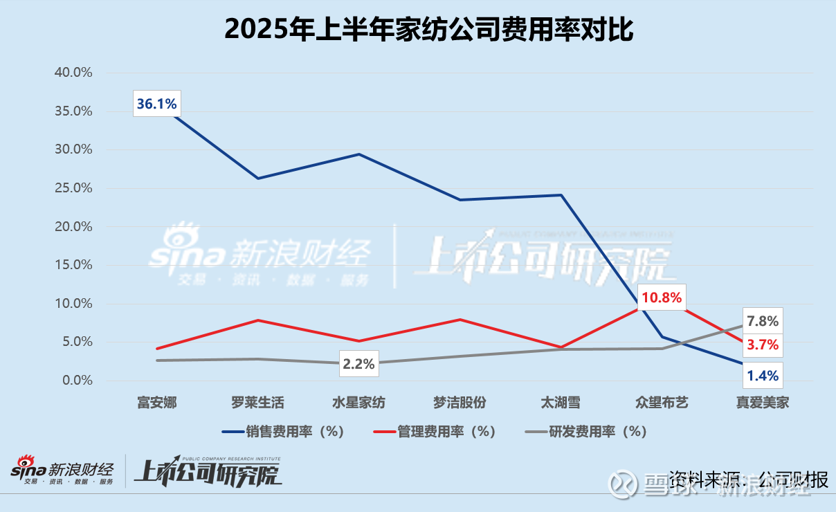 家纺公司的研发费用率基本在3%-4%之间。2025年上半年,真爱美家研发费用率达7.8%领跑,水星家纺以2.2%研发费用率垫底。罗莱生活、梦洁股份、众望布艺研发投入均以双位数减少,富安娜研发直接投入同比锐减近六成。