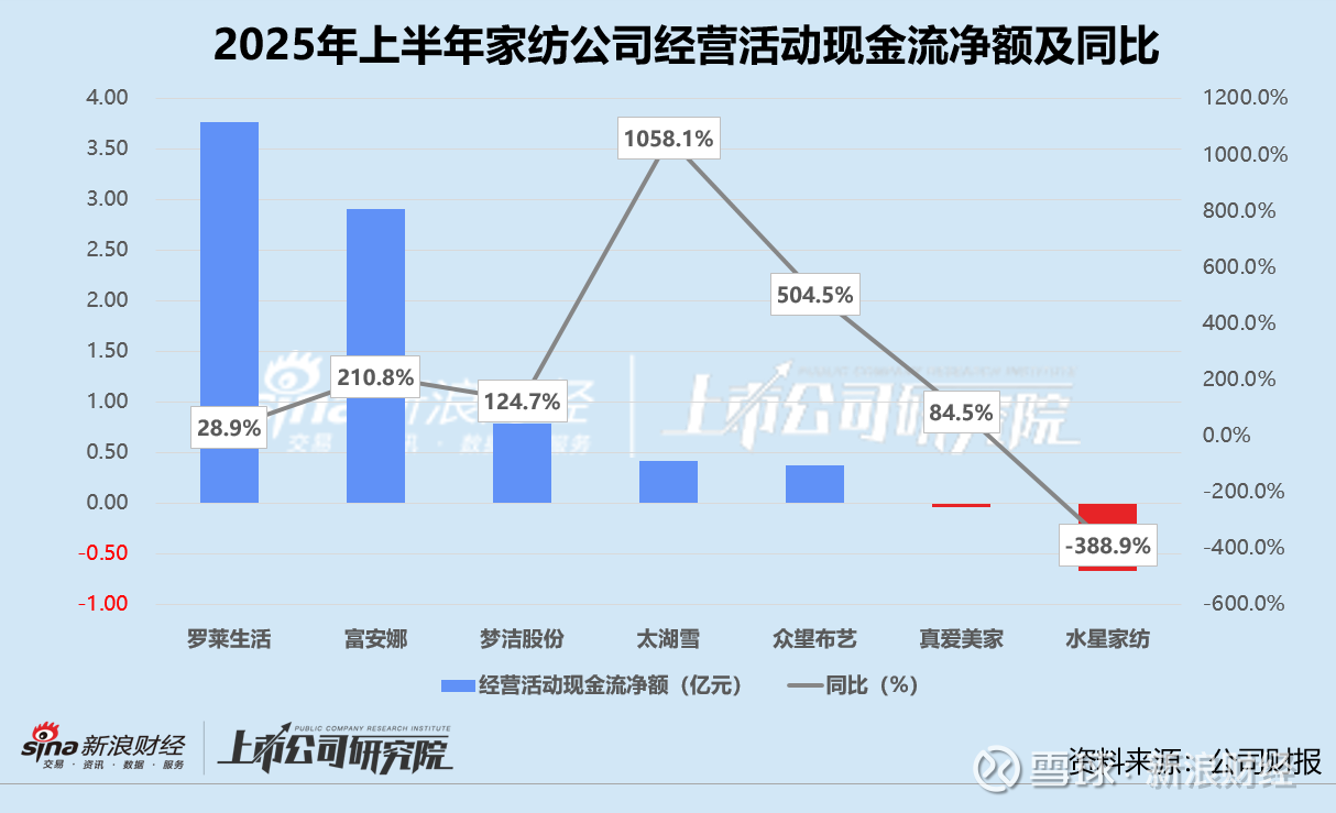 就盈利质量而言,报告期内约57.1%的公司经营活动现金流同比增幅超100%,太湖雪和众望布艺经营性现金流更是由负转正。罗莱生活的经营活动现金流净额一骑绝尘,同比增长28.9%至3.77亿元,主要因为其购买商品、接受劳务支付的现金减少32.6%。真爱美家和水星家纺的经营活动现金流均为净流出,尤其水星家纺因支付货款、支付经营费用,现金流净额从2024年上半年的2312.77万元转变为-6681.24万元。