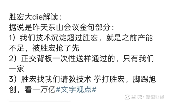 网络流传的版本中,东山精密的发言被加工成“金句”:一是“我们技术沉淀超过胜宏,只是之前产能不足被胜宏抢了先”;二是“正交背板一次性送样通过的,只有我们一家”;三是“胜宏找我们请教技术,拳打胜宏创,脚踢旭创,看一万亿”。这些片段迅速发酵,叠加市场对热门赛道AI、PCB的高度敏感,直接冲击了胜宏科技的盘面。