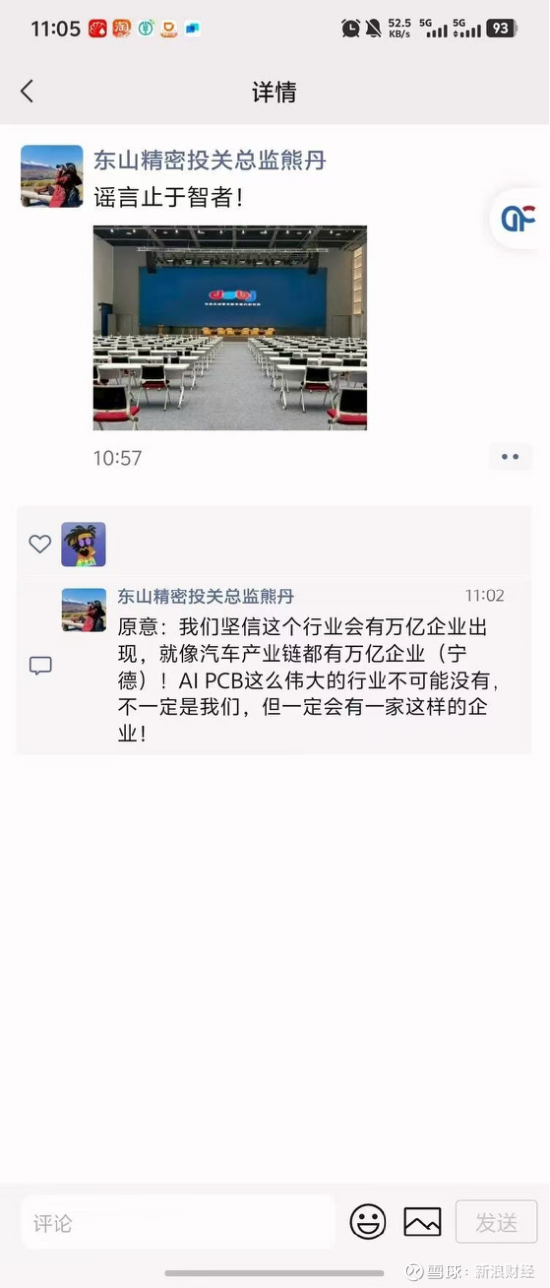 面对迅速扩散的舆情,疑似东山精密投关总监熊丹在17日上午11点左右通过朋友圈发声,明确表示“谣言止于智者”。在评论区,她进一步澄清原意:“我们坚信这个行业会有万亿企业出现,就像汽车产业链都有万亿企业(宁德)!AI、PCB这么伟大的行业不可能没有,不一定是我们,但一定会有一家这样的企业!”言下之意,并非指向某家公司,而是强调行业的整体发展前景。