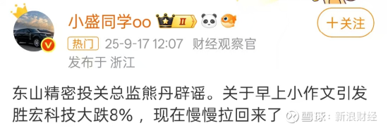 事件迅速引发微博内的财经博主的关注。财经博主@小盛同学oo 当日中午发文称:“东山精密投关总监熊丹辟谣。关于早上小作文引发胜宏科技大跌8%,现在慢慢拉回来了。”