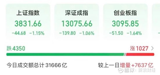 今天,A股三大指数集体回调。全市场成交额为31666亿元,较上日增加7637亿元。截至收盘,上证指数下跌1.15%,深证成指下跌1.06%,创业板指下跌1.64%。