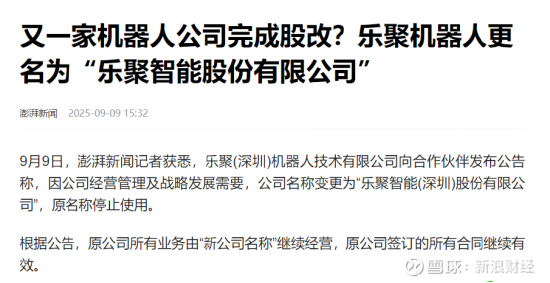 据澎湃新闻,9月9日,记者获悉,乐聚(深圳)机器人技术有限公司向合作伙伴发布公告称,因公司经营管理及战略发展需要,公司名称变更为“乐聚智能(深圳)股份有限公司”,原名称停止使用。根据公告,原公司所有业务由“新公司名称”继续经营,原公司签订的所有合同继续有效。
