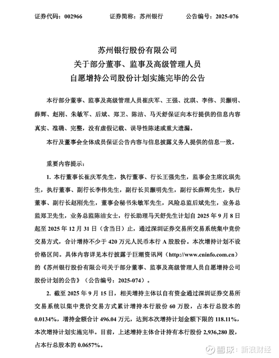 9月16日,苏州银行发布了关于部分董事、监事及高级管理人员自愿增持公司股份计划实施完毕的公告。