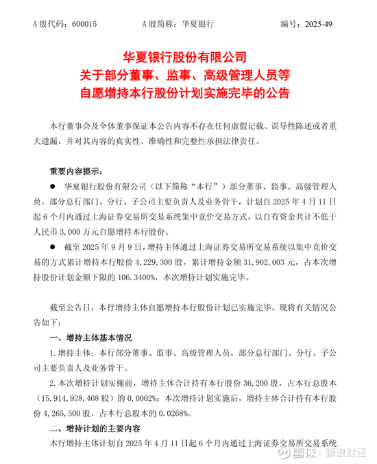 其中,华夏银行董监高增持计划已于近期实施完毕。9月10日,华夏银行发布的公告显示,截至今年9月9日,该行部分董事、监事、高级管理人员,部分总行部门、分行、子公司主要负责人及业务骨干累计增持该行股份422.93万股,累计增持金额约3190万元。