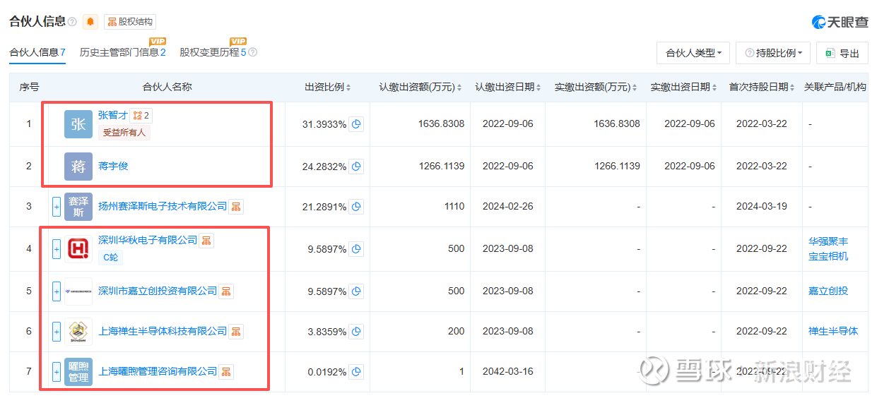 天眼查显示,琻捷电子收购聚洵半导体时的交易对象中,华秋电子、嘉立创、上海禅生分别持有共青城英锐创投资合伙企业(有限合伙)(以下简称“共青城英锐创”)9.5897%、9.5897%和3.8359%的出资份额比例(首次持股日期为2022年9月)。此外,自然人张智才、蒋宇俊持有共青城英锐创31.3933%、24.2832%的股份(持股日期自2022年3月起)。