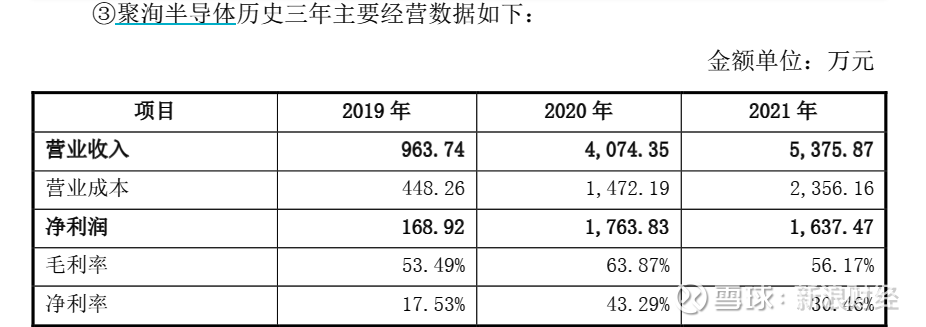 根据科隆股份关注函回复公告,2019-2021年,聚洵半导体的营业收入分别为963.74万元、4174.35万元及5375.87万元,净利润分别为158.93万元、1763.83万元及1637.47万元。