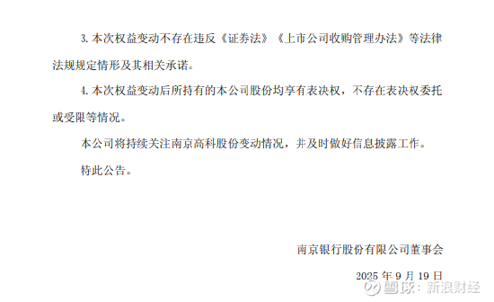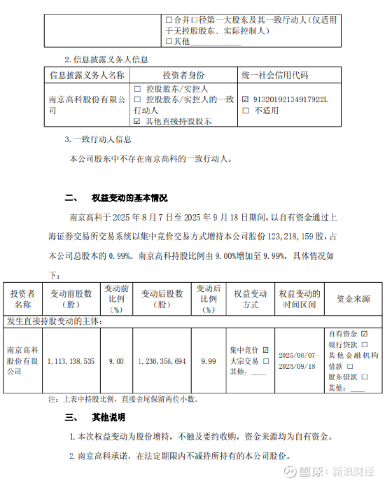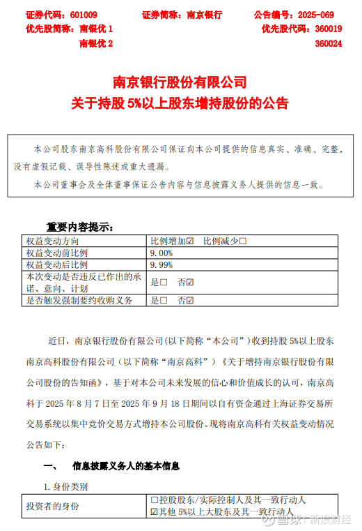 9月19日金融一线消息,南京银行公告称,持股5%以上股东南京高科股份有限公司于2025年8月7日至2025年9月18日期间,以自有资金通过上海证券交易所集中竞价方式增持公司股份1.23亿股,占公司总股本0.99%,持股比例由9.00%升至9.99%;增持后所持股份均享有表决权;南京高科承诺在法定期限内不减持。