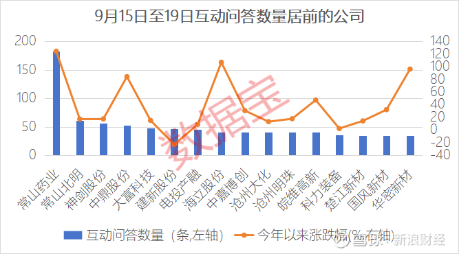 市场表现方面,整体来看,截至9月19日,本周获投资者关注的公司年内平均涨幅超过30%,大幅跑赢同期沪深300指数,关注度较高的公司市场表现更为强势。互动问答超过50条的公司,年内平均涨幅最高,超过60%,常山药业、中鼎股份年内涨幅均超过80%,互动问答为1~3条的公司,平均涨幅低于33%。