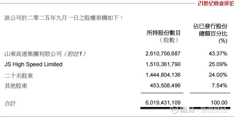 9月18日晚,香港证监会详细披露其股权架构:两大股东山东高速集团、JS High Speed Limited,累计持股68.5%;20名股东共持股24%;其它股东仅持有4.53亿股,持股比例为7.54%。