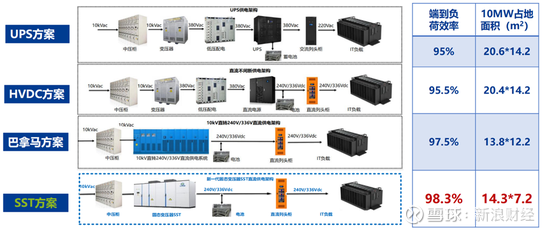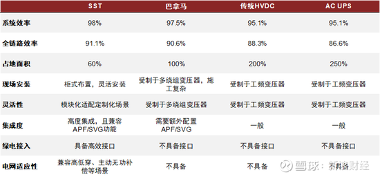 SST方案大幅提升空间利用率和供电效率,长期看有望成为数据中心直流供电的最佳选择。SST路线保留了巴拿马电源的优势,延续一体化设计,最大区别在于采用电力电子技术和高频变压器替代传统工频变压器,减小体积和重量,大幅提高效率。具体优势上: