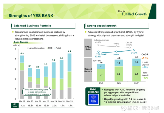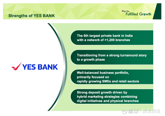 首先,作为印度第六大私人银行,YES银行拥有超过1200个分支机构的广泛网络,具备强大的实体基础。其次,该行正从转型过渡到增长阶段,展现出巨大的发展潜力。第三,其业务组合均衡,主要专注于快速增长的中小企业和零售业,这两个领域正是印度经济最具活力的部分。第四,YES银行通过结合数字计划和实体分行的混合营销策略,推动存款强劲增长,显示出良好的运营能力。