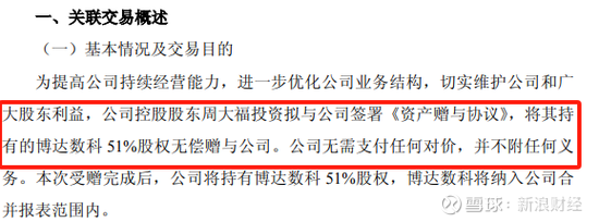 9月23日晚,ST景谷(600265)发布公告称,公司控股股东周大福投资有限公司拟将其持有的上海博达数智科技有限公司(以下简称“博达数科”)51%股权无偿赠与公司。本次赠与无需ST景谷支付任何对价,亦不附加任何义务。受赠完成后,ST景谷将持有博达数科51%股权,后者将被纳入公司合并报表范围。