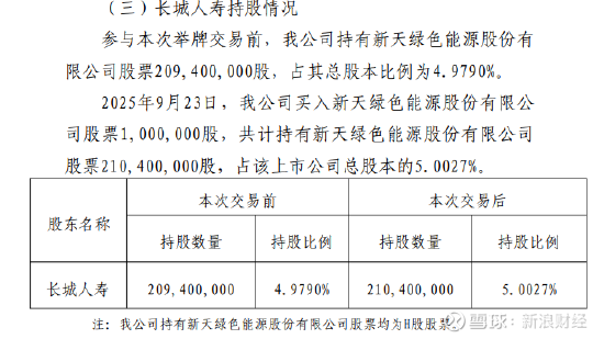 9月25日金融一线消息,长城人寿保险股份有限公司(以下简称“长城人寿”)发布举牌新天绿能公告称,与本次举牌交易前,长城人寿持有新天绿能股票2.094亿股,占其总股本比例为4.9790%。9月23日,长城人寿买入新天绿能股票100万股,共计持有新天绿能2.104亿股,占该上市公司总股本的5.0027%。