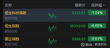 9月26日消息,港股三大指数集体下跌。截至午间收盘,恒生指数跌0.65%,报26312.90点,恒生科技指数跌1.04%,国企指数跌0.61%。盘面上,科网股普跌,小米跌超5%,阿里巴巴、京东、快手跌超1%;风电股走强,瑞风新能源涨8%;内房股普涨,碧桂园涨超3%;汽车股活跃,小鹏汽车涨超6%;生物医药概念走弱,荣昌生物跌超3%。
